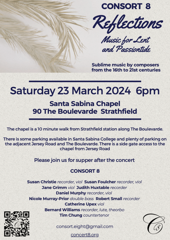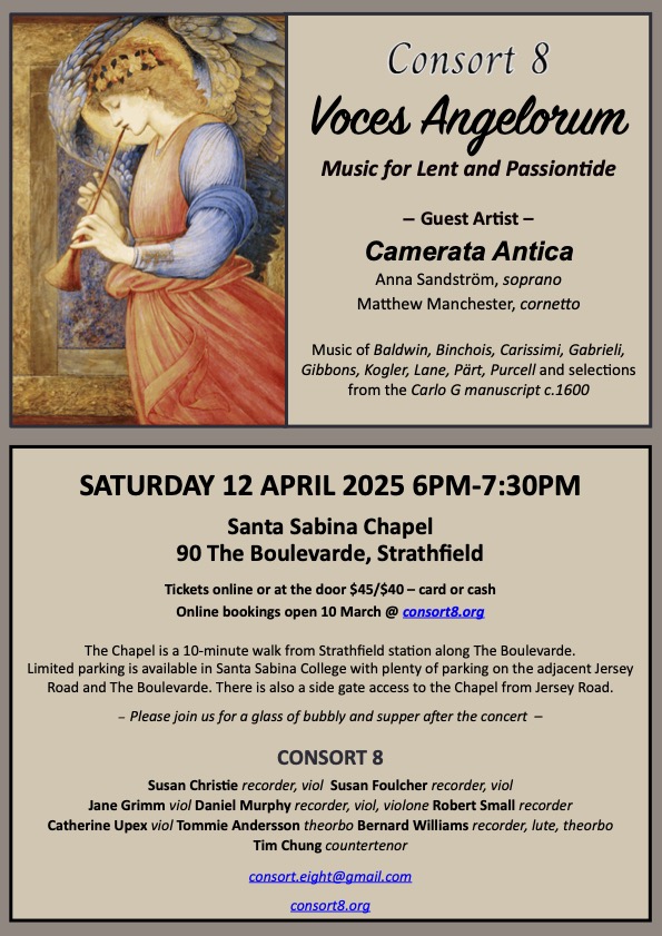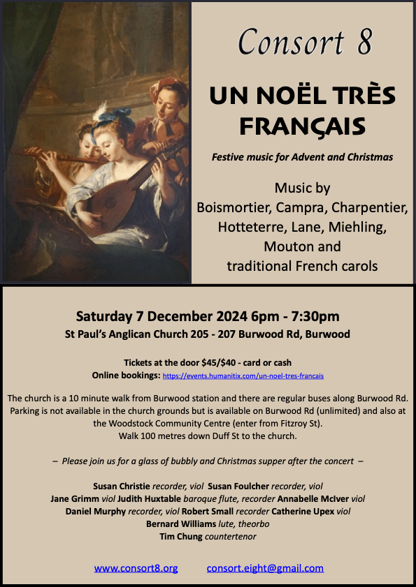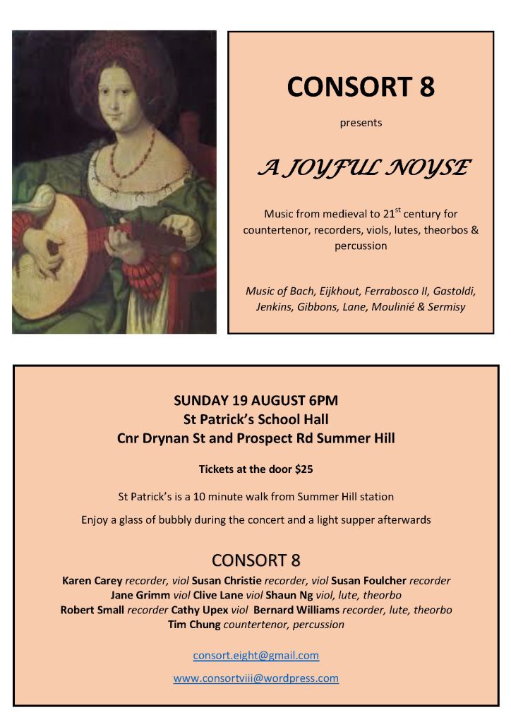 With carols dating from the 14th century to the present day, the program includes the joyful multivoice music of Hieronymous and Michael Praetorius, 2 movements from JS Bach’s Brandenburg Concerto no 6 (arranged by Consort 8), William Byrd’s anthem for voice and viols (From Virgin’s womb this day) and Lance Eccles’ beautiful Rorate Caeli.
