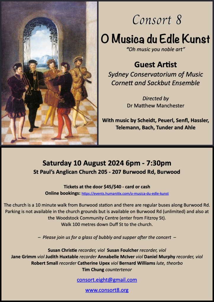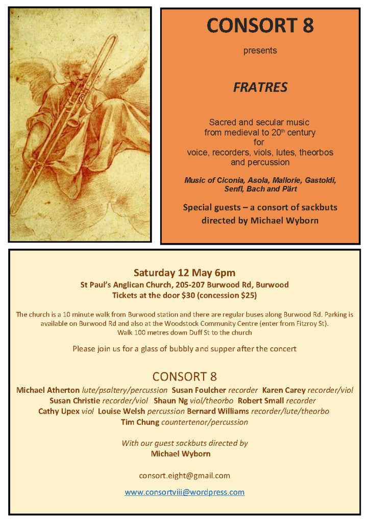 ‘A Celebration of Eastertide’ – With consorts of recorders, viols, sackbuts, lutes, theorbos and countertenor. Sacred music from the Renaissance and Baroque together with secular songs and dances. Come and hear the unique sound of sackbuts in our beautiful new home at St Paul’s Anglican Church, Burwood