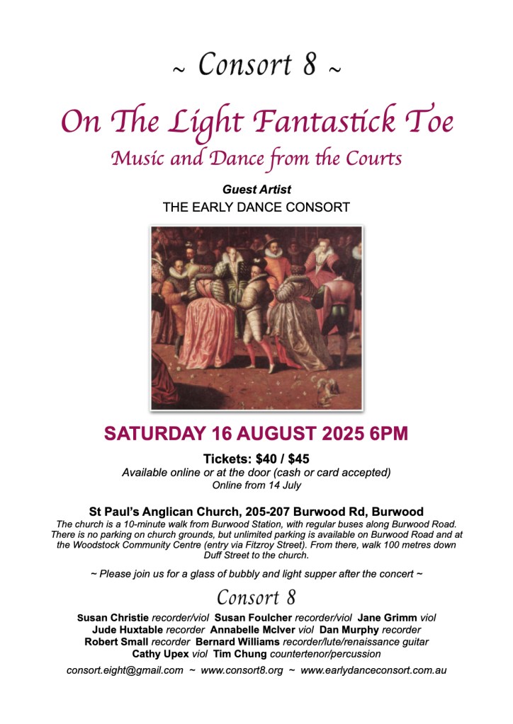 The concert, Courtly Ayres and Dances, promises to be a visual feast, with The Early Dance Consort performing renaissance and baroque dancing against the beautiful backdrop of St Paul’s Church. Consort 8 will perform music from England, France and Spain and as usual, we have found some hidden “gems” to delight you.