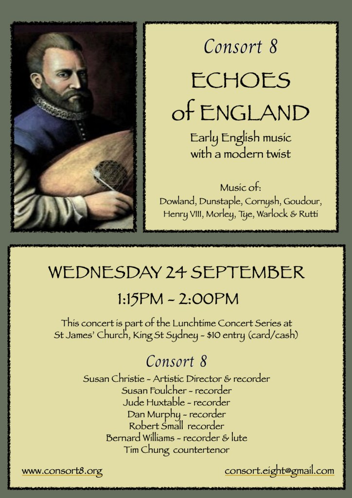 We had a myriad of composers in our first concert – J S Bach, Binchois, Byrd, Caldini, Eccles, Ferrabosco, Kedrov, Kogler, Lane, Navarro, Palestrina, Tallis and Tunder. The program included Bach’s “O Haupt voll Blut und Wunden”, Eccles’ Gregorian Fantasies, Caldini’s Christe, Ferrabosco’s Fantasie a 6 bassi, Tallis’ If Ye Love Me, Tunder’s Ach Herr, lass deine lieben Engelein and two consort songs of Byrd.