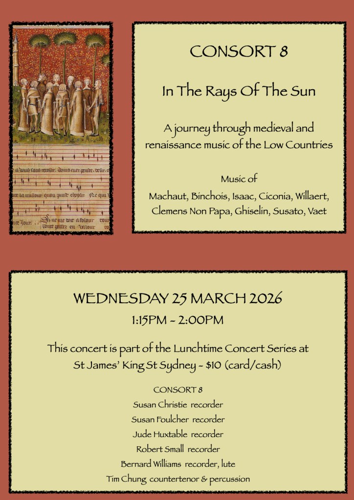 With carols dating from the 14th century to the present day, the program includes the joyful multivoice music of Hieronymous and Michael Praetorius, 2 movements from JS Bach’s Brandenburg Concerto no 6 (arranged by Consort 8), William Byrd’s anthem for voice and viols (From Virgin’s womb this day) and Lance Eccles’ beautiful Rorate Caeli.