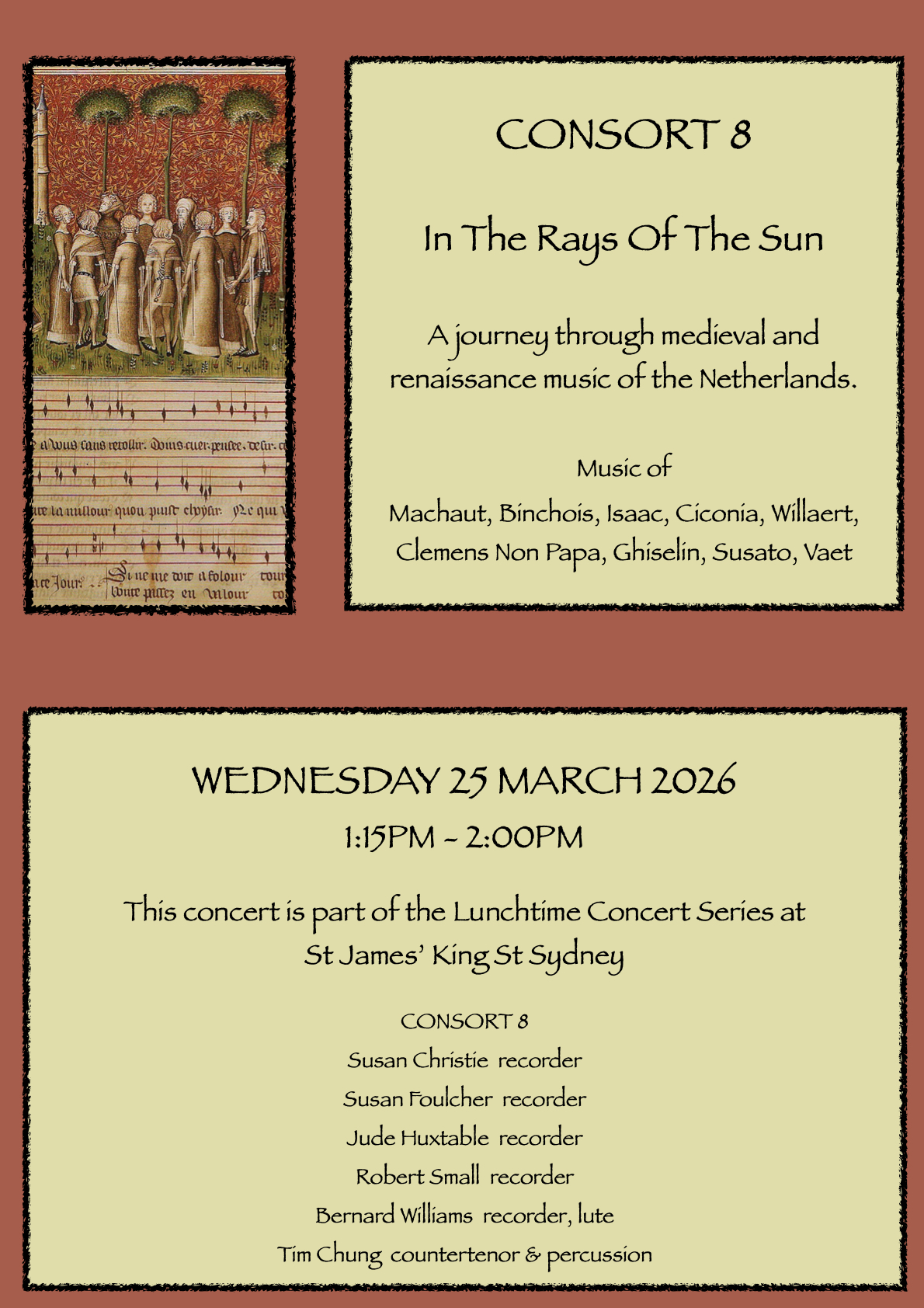 Sydney’s unique early music ensemble, Consort 8 encompasses consorts of recorders and violas da gamba, lutes, theorbos, voice and percussion.